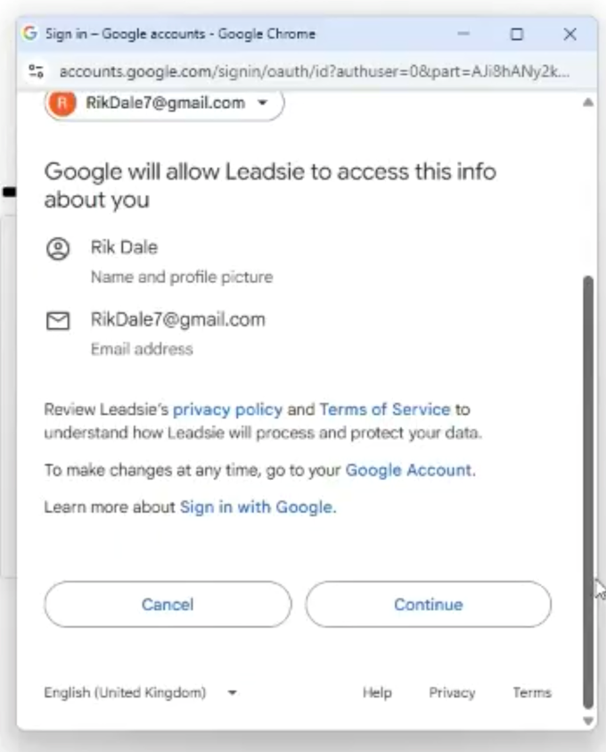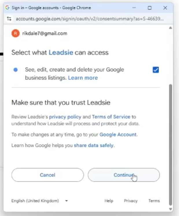 3. You will need to give Leadsie permission to access, by clicking “Continue”